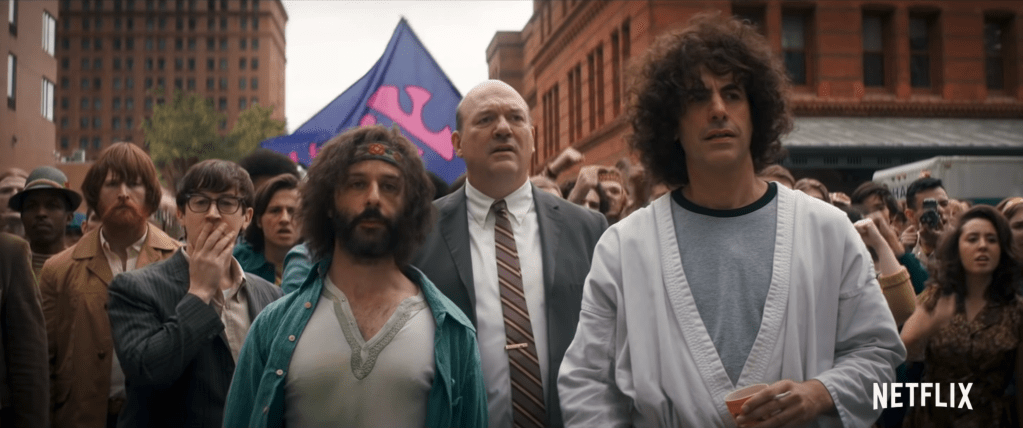 The cast plays to the story wonderfully, with my personal favorite character being Sacha Baron Cohen’s Abbie Hoffman. Cohen’s performance elevates an already complex character into one that the audience grows to respect and understand. Part of this of course is Abbie Hoffman being already a character himself, putting on an act in a sense to build support for his cause, so Cohen’s ability to character act so well truly shows how complex Abbie Hoffman was.